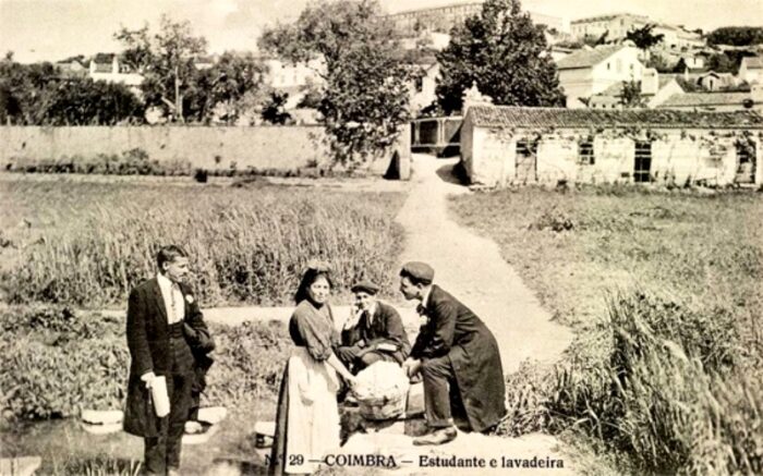 Não sei datar com precisão a fotografia que ilustra este velho postal de Coimbra, comprado num quiosque que existiu ao lado da Pastelaria Central. Será, muito provavelmente, dos finais do século XIX ou logo do início do seguinte. Presumo que alguns a observem com um misto de nostalgia e de subordinação à visão de uma cidade profundamente estratificada mas que sem qualquer vigilância crítica tendem a embelezar e a associar a uma certa ideia de tradição. Eu vejo-a como uma imagem quase pornográfica. Como estereótipo, mas também como vestígio de um tempo, ultrapassado embora não apagado, no qual as lavadeiras do Mondego, as «lindas tricanas» das quais ainda tratam certas versalhadas ou legendas de souvenirs locais – eu ainda conheci algumas das derradeiras, já velhas, gastas, pobres e abandonadas –, desempenhavam o papel social que ela tão tristemente documenta.